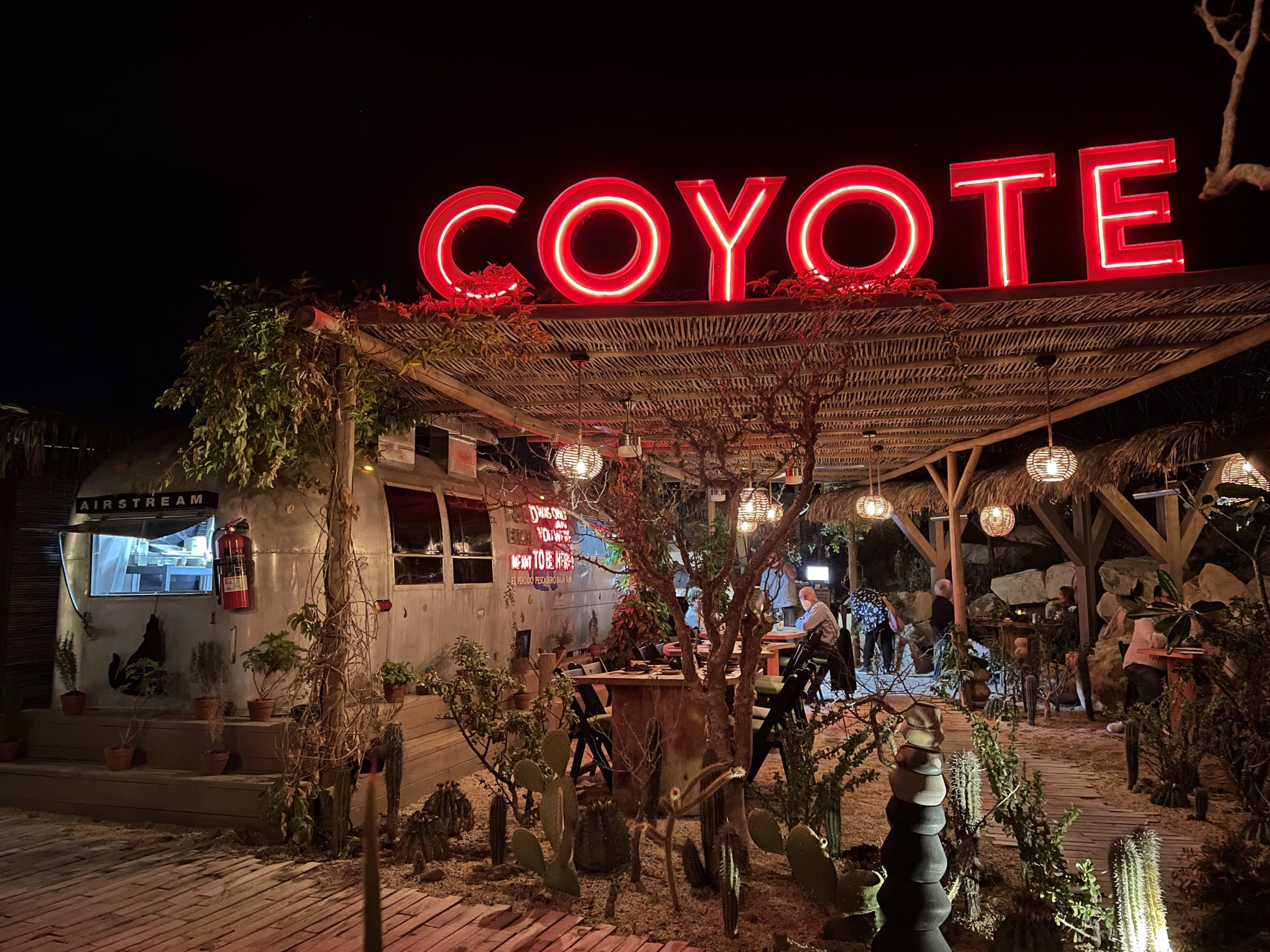 Even before you “enter” Coyote – that is to say, before you go from the middle of the nowhere to a covered and very vibe-y middle of nowhere, you can feel that something is different here. You are greeted with a hand sanitizing station and a boulder with a fun inscription on it. Colored lights set the mood.