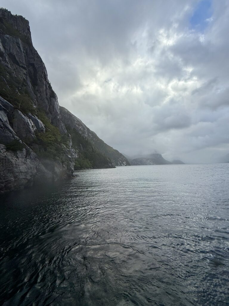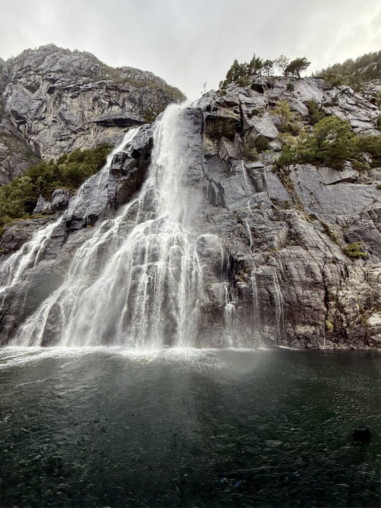 Unfortunately, the weather wasn’t great on the day of my friend’s cruise, but the sights made up for it. She saw waterfalls, mountain goats, and the spectacular natural backdrop from the waters of the beautiful fjord.