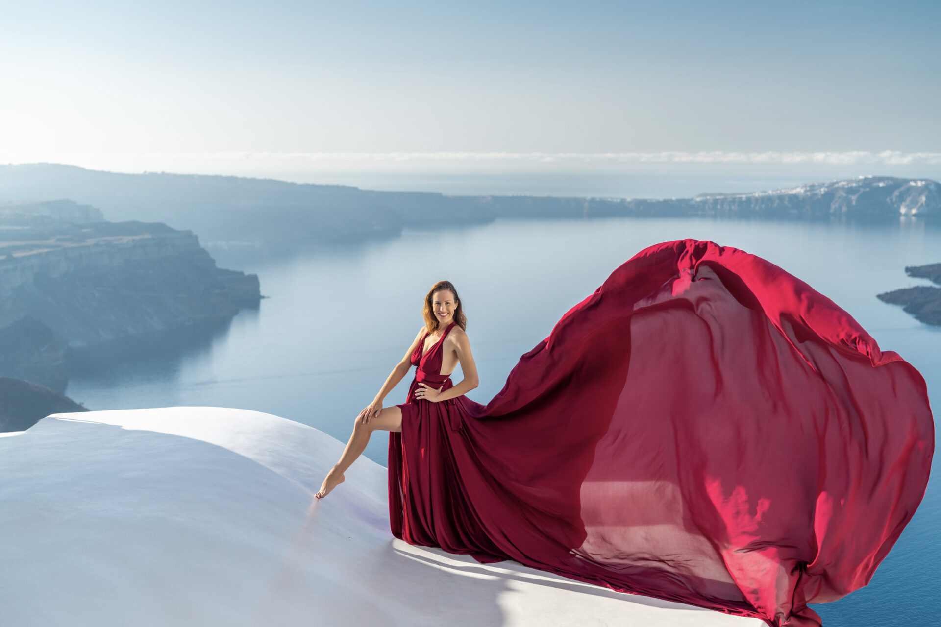 There are several towns where most companies offer flying dress photo shoots – Oia, Imerovigli, and Fira.